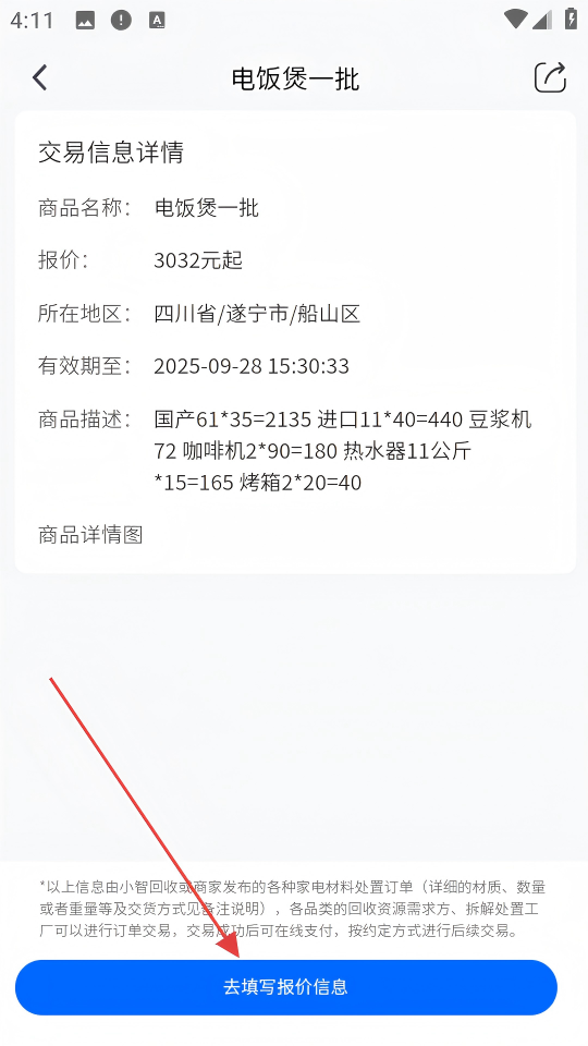 3、在“电饭煲一批”交易信息详情页,点击【去填写报价信息】,进入提交报价页面。