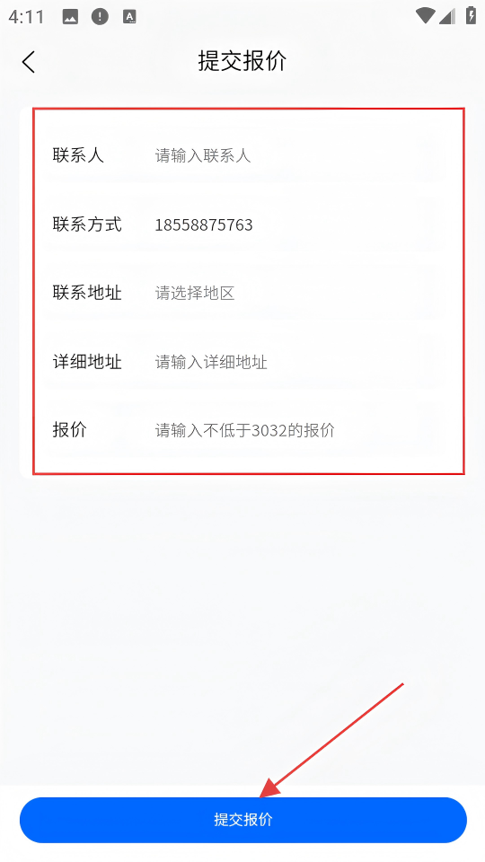 4、在提交报价页面,填写联系人、报价等信息后,点击【提交报价】,完成报价提交操作。