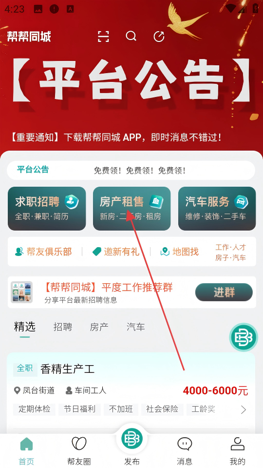 1、点击【房产租售】,进入房产租售页面。