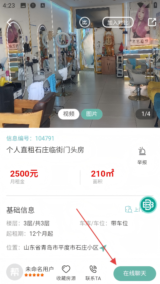 3、在房源详情页面,点击【在线聊天】,进入与房东的聊天界面。