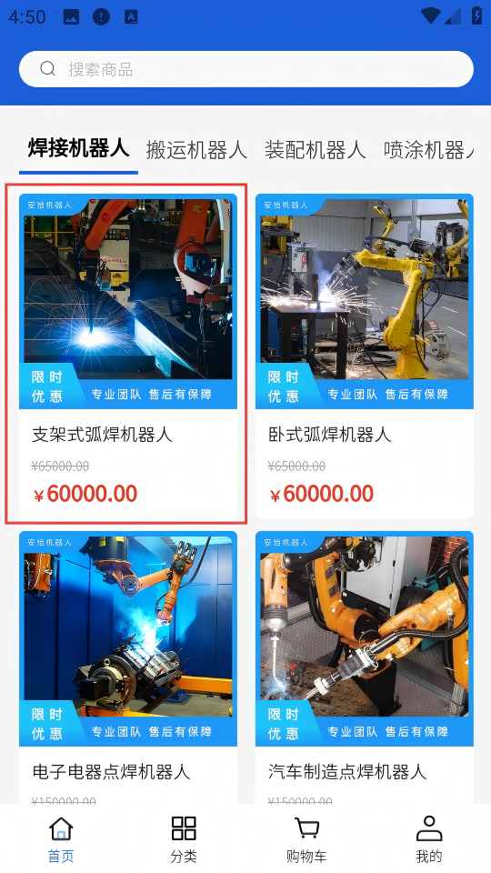 1、智能商品分类:按应用场景、品牌、价格区间多维划分商品,支持焊接/搬运等20+品类精准筛选,快速匹配企业生产需求。