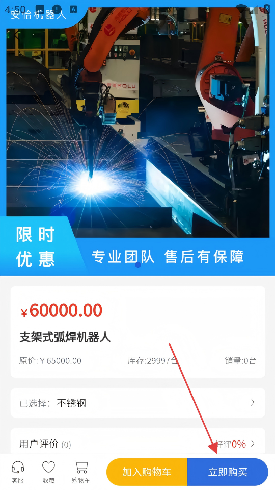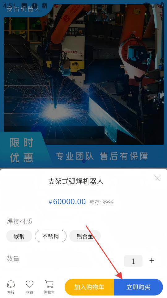1、在首页选择【支架式弧焊机器人】商品,进入该商品详情页面。