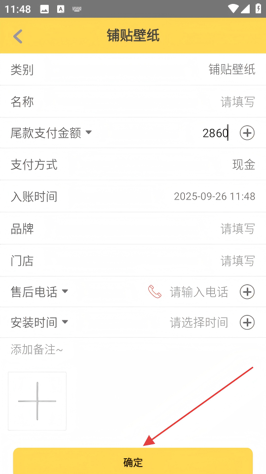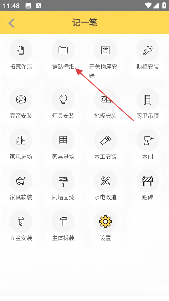2、在“记一笔”页选择【铺贴壁纸】项目,进入铺贴壁纸的记账详情填写页。