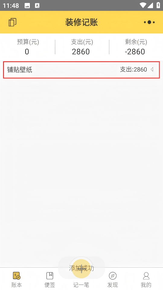 4、返回装修记账首页,可看到“铺贴壁纸”的支出记录已成功添加,支出金额等数据同步更新。