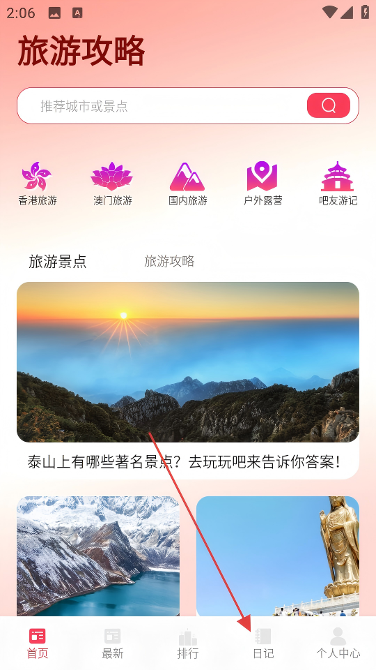 1、在“旅游攻略”页面点击底部【日记】,进入日历界面。