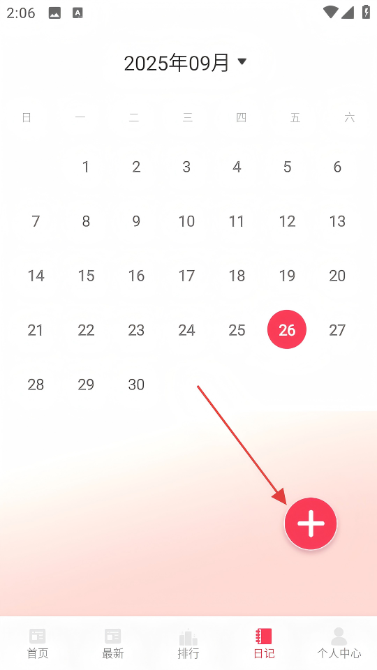 2、在日历界面点击右下角红色“+”号,进入日记编辑页面。