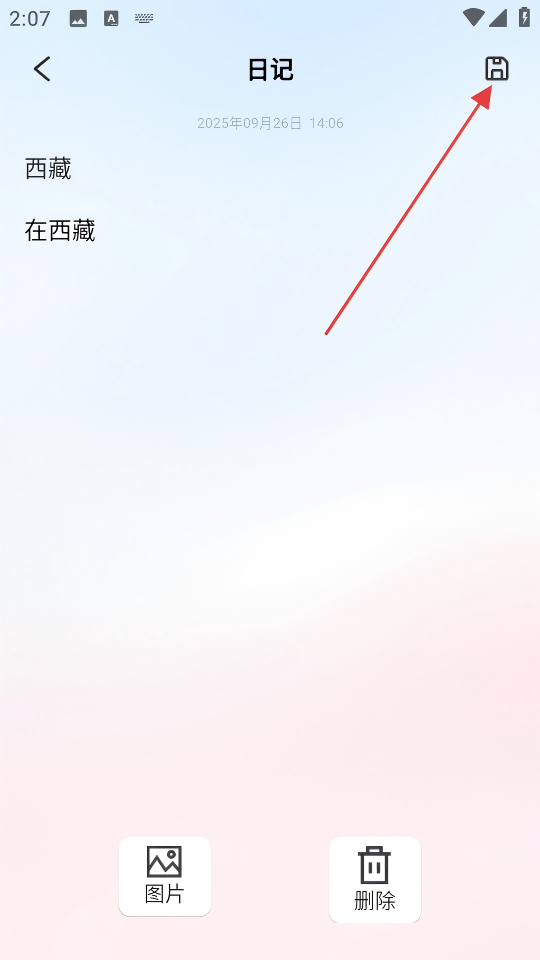 3、在日记编辑页输入内容后,点击右上角的保存图标,完成日记保存。