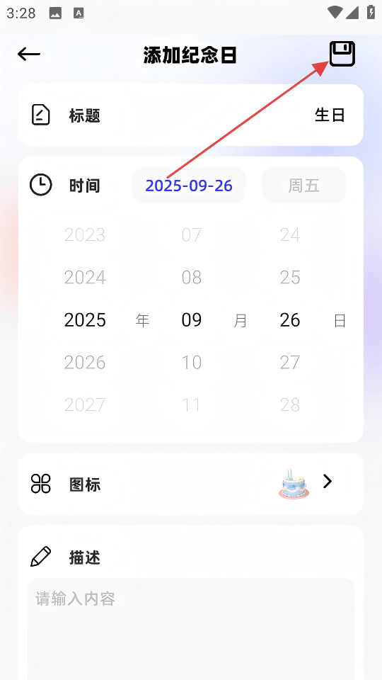 3、在“添加纪念日”页设置标题、时间等信息后,点击右上角保存图标。
