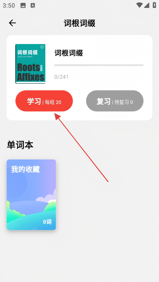 2、在词根词缀页面点击【学习-每组20】,进入学习界面。