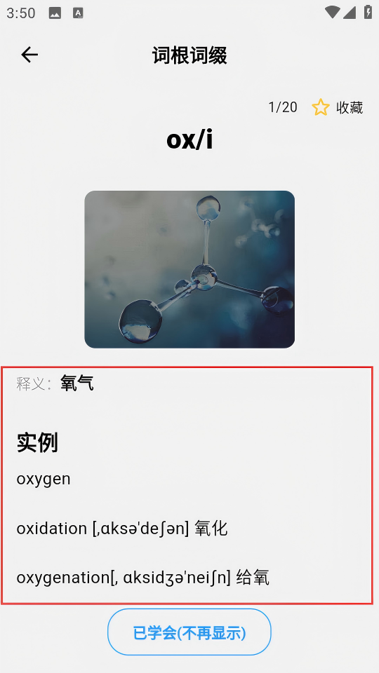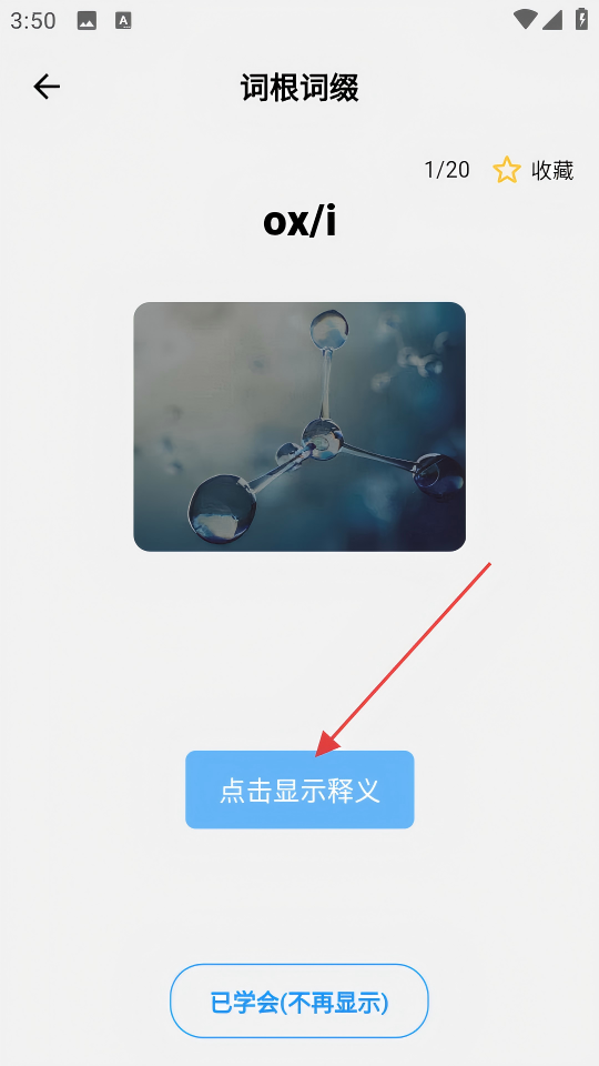 3、在学习界面,点击【点击显示释义】,查看该词根的释义。