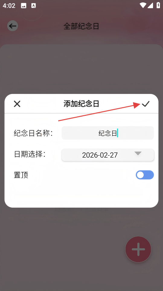 3、在“添加纪念日”窗口填写纪念日名称、选择日期,点击右上角对勾。