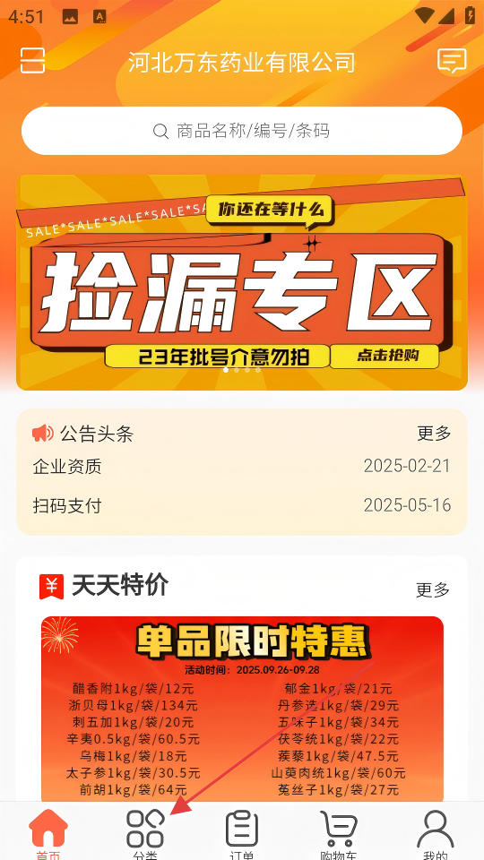 1、进入页面后,点击底部【分类】按钮,进入商品分类页面。