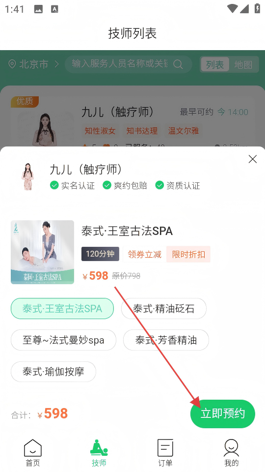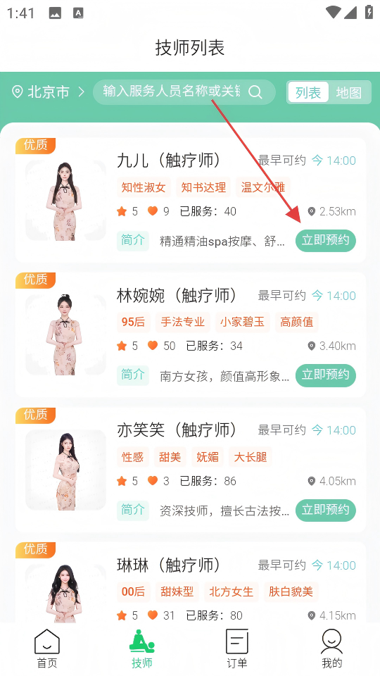 2、在技师列表中,选择目标技师,点击其对应的【立即预约】按钮。