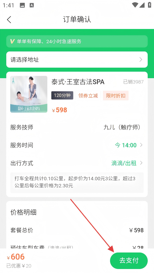 4、进入订单确认页面,选择地址等信息,点击【去支付】按钮,完成支付操作。