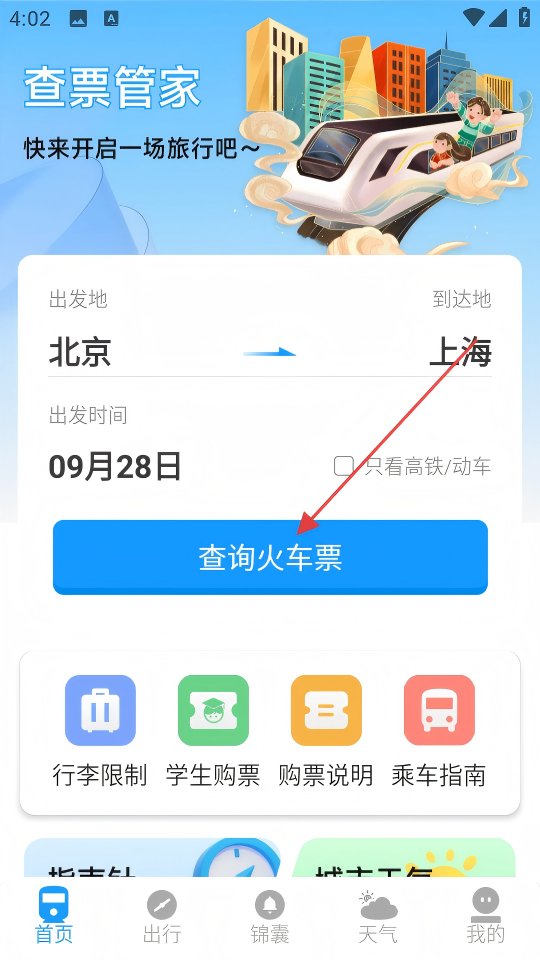 1、在查票管家首页,设置出发地为、到达地为、出发时间为,点击【查询火车票】。