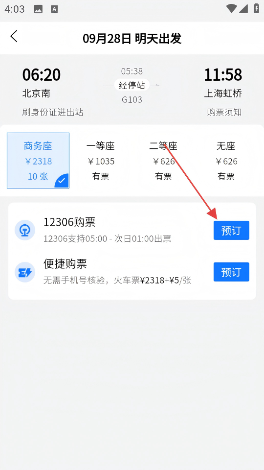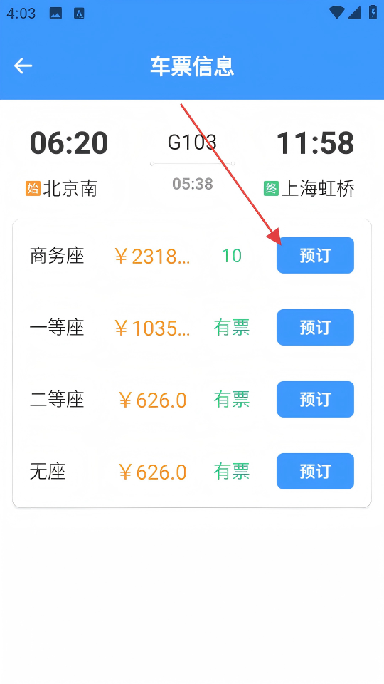 3、进入G103次列车的车票信息页,选择要预订的座位类型,点击该座位旁的【预订】按钮。