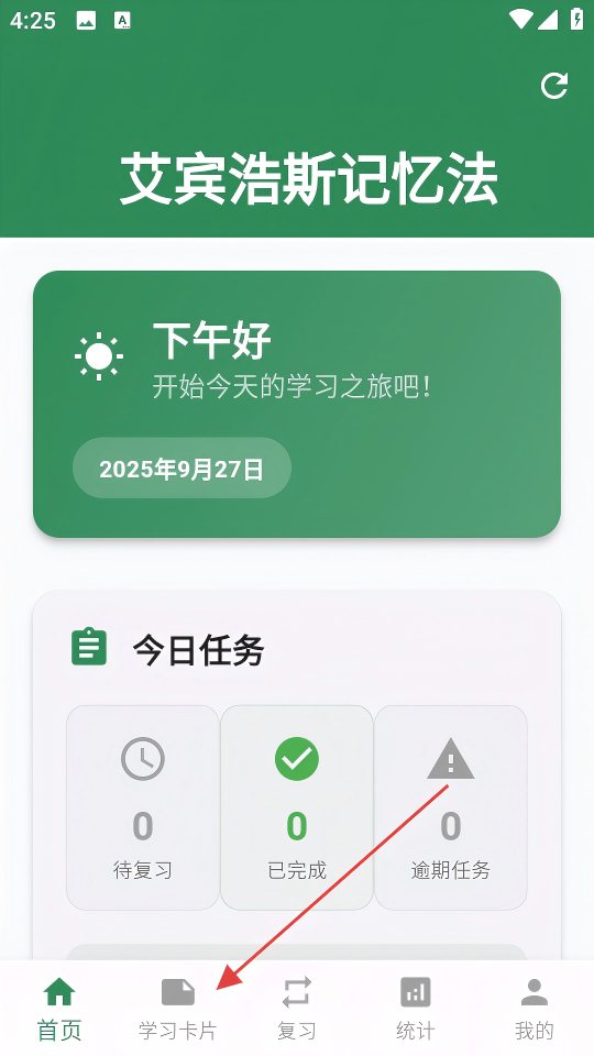 1、在首页点击底部【学习卡片】,进入学习卡片页面。