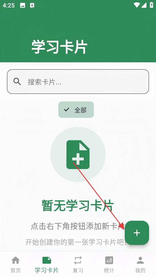 2、在学习卡片页面,点击右下角绿色“+”按钮,开始创建新的学习卡片。