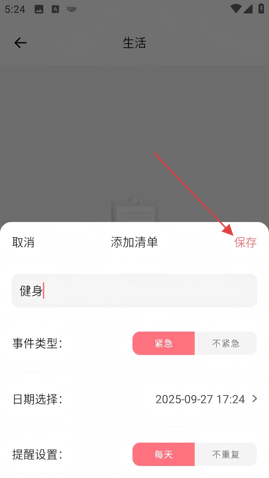 4、在添加清单窗口,输入清单内容,设置事件类型、日期选择、提醒设置等信息后,点击【保存】。