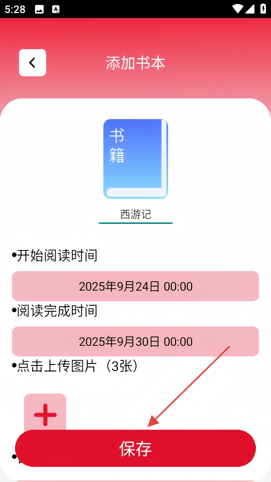 3、在添加书本页面,设置书籍名称、开始阅读时间、阅读完成时间等信息后,点击【保存】按钮。