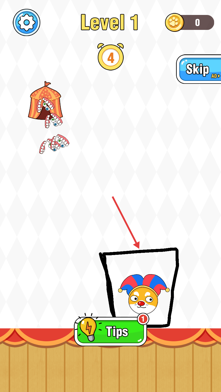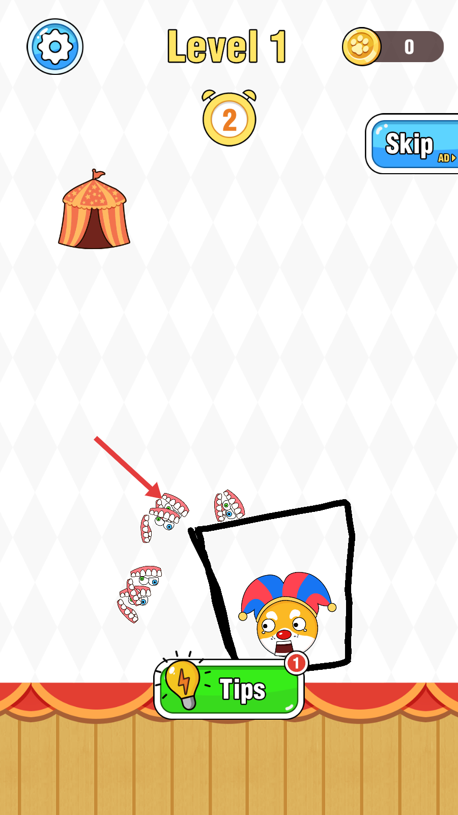 2、在Level1中,画出线条保护小丑,抵御牙齿攻击。