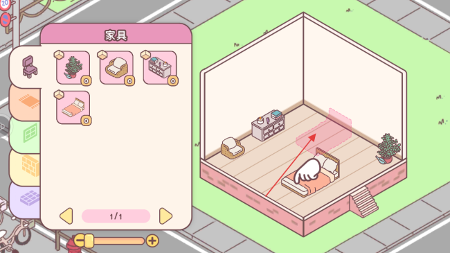 2、打开【家具】菜单,选择喜欢的家具,如盆栽、座椅、橱柜等,将其放置到房间合适位置,打造房间布局。