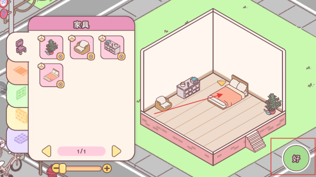 4、床摆放好后,点击右下角【好】按钮,确认此次房间家具布置操作,完成当前布置任务。