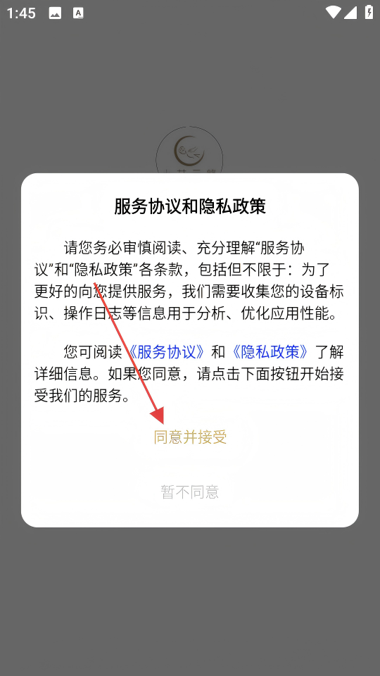 1、首次使用时,阅读【服务协议和隐私政策】,点击【同意并接受】,进入app页面。