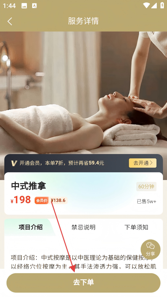 3、在服务详情页,点击【去下单】,进入技师选择页面。