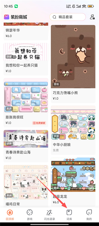 1、我们可以先在【装扮商城】逛逛,之后记得点击【词库】按钮哦。