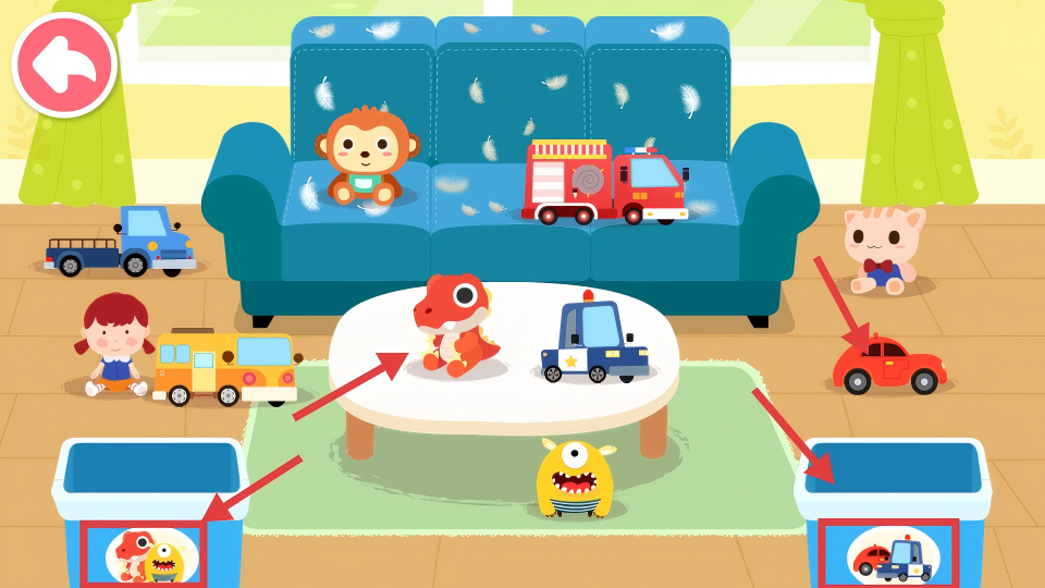3、将不同的玩具,对应放入带有相应玩具图案的箱子里。