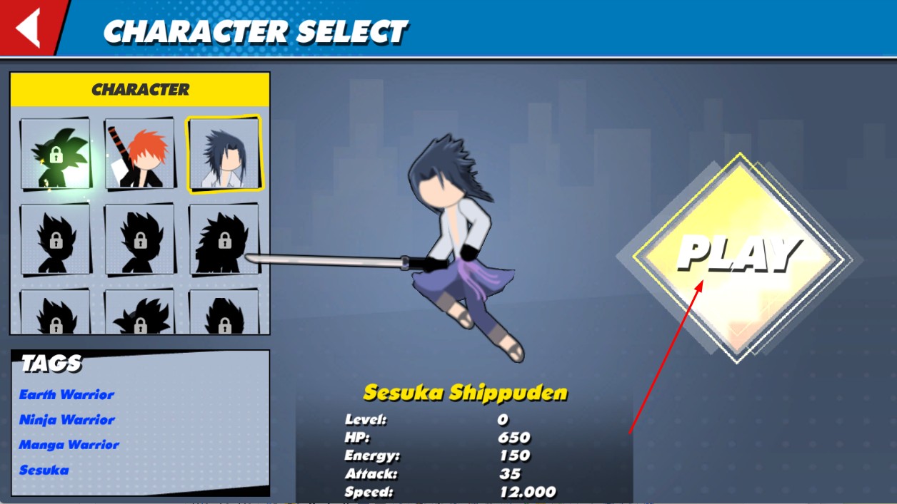 2、在角色选择页,选佐助角色,点【PLAY】,进入战斗。