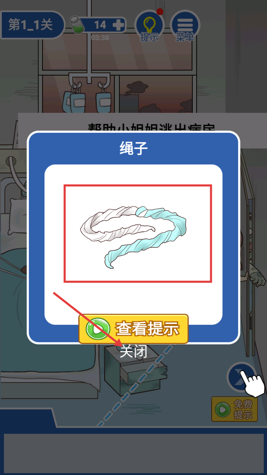 4、获得绳子道具后,点击【关闭】,继续游戏流程。