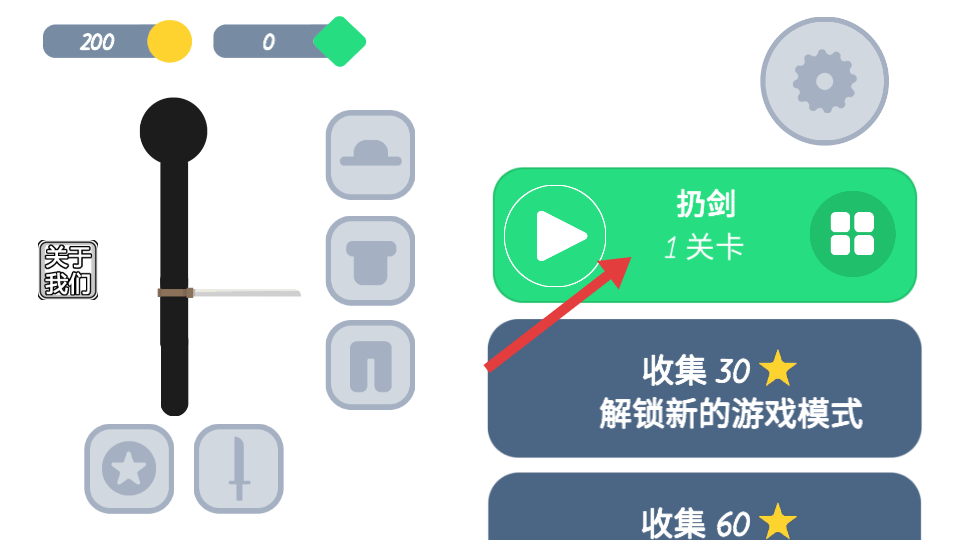 1、在游戏首页点击绿色的【扔剑1关卡】按钮,进入第一关游戏。