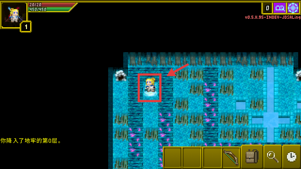 3、进入地牢,操控像素角色在蓝色风格的地牢场景中移动,探索地图区域。