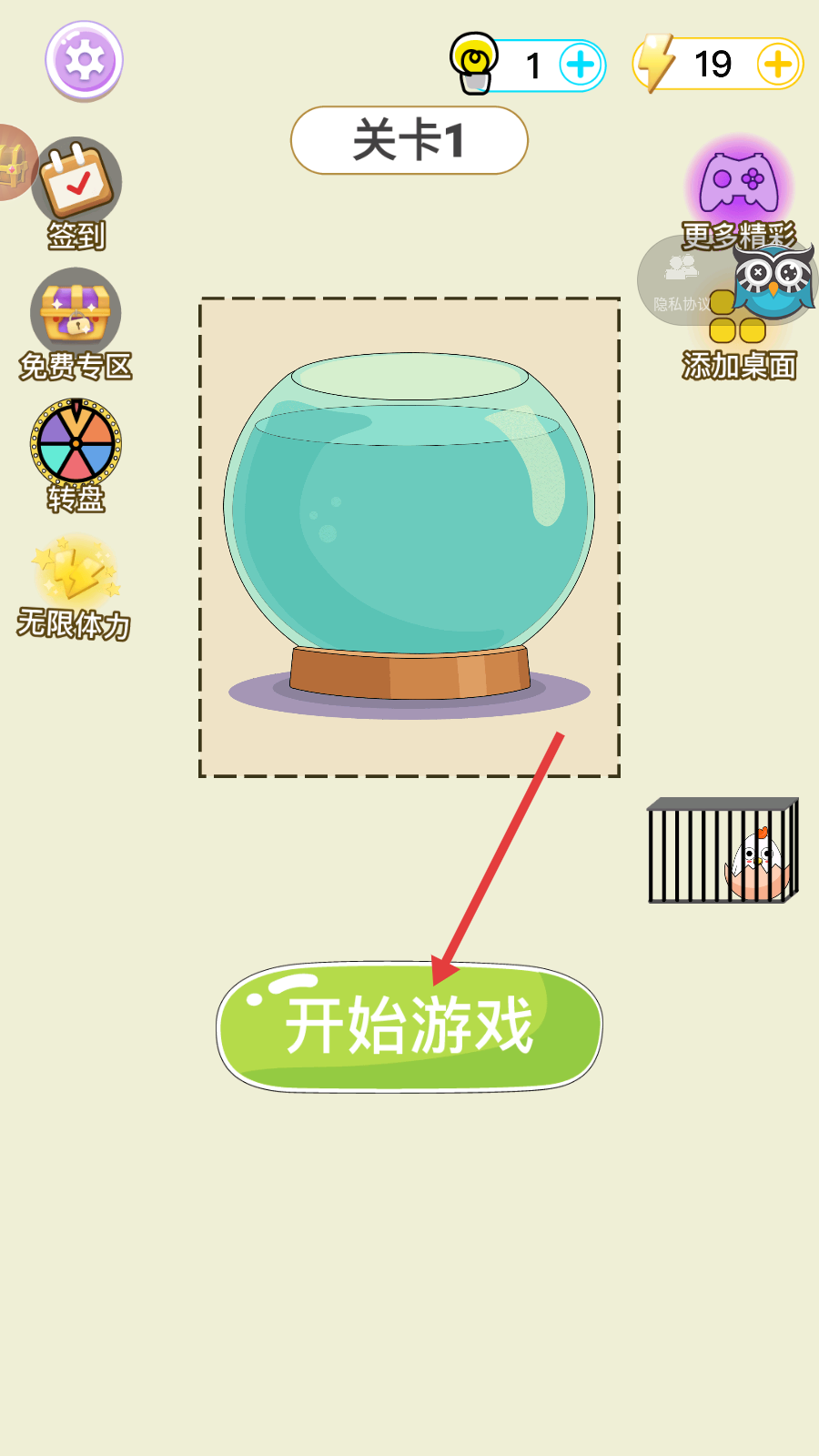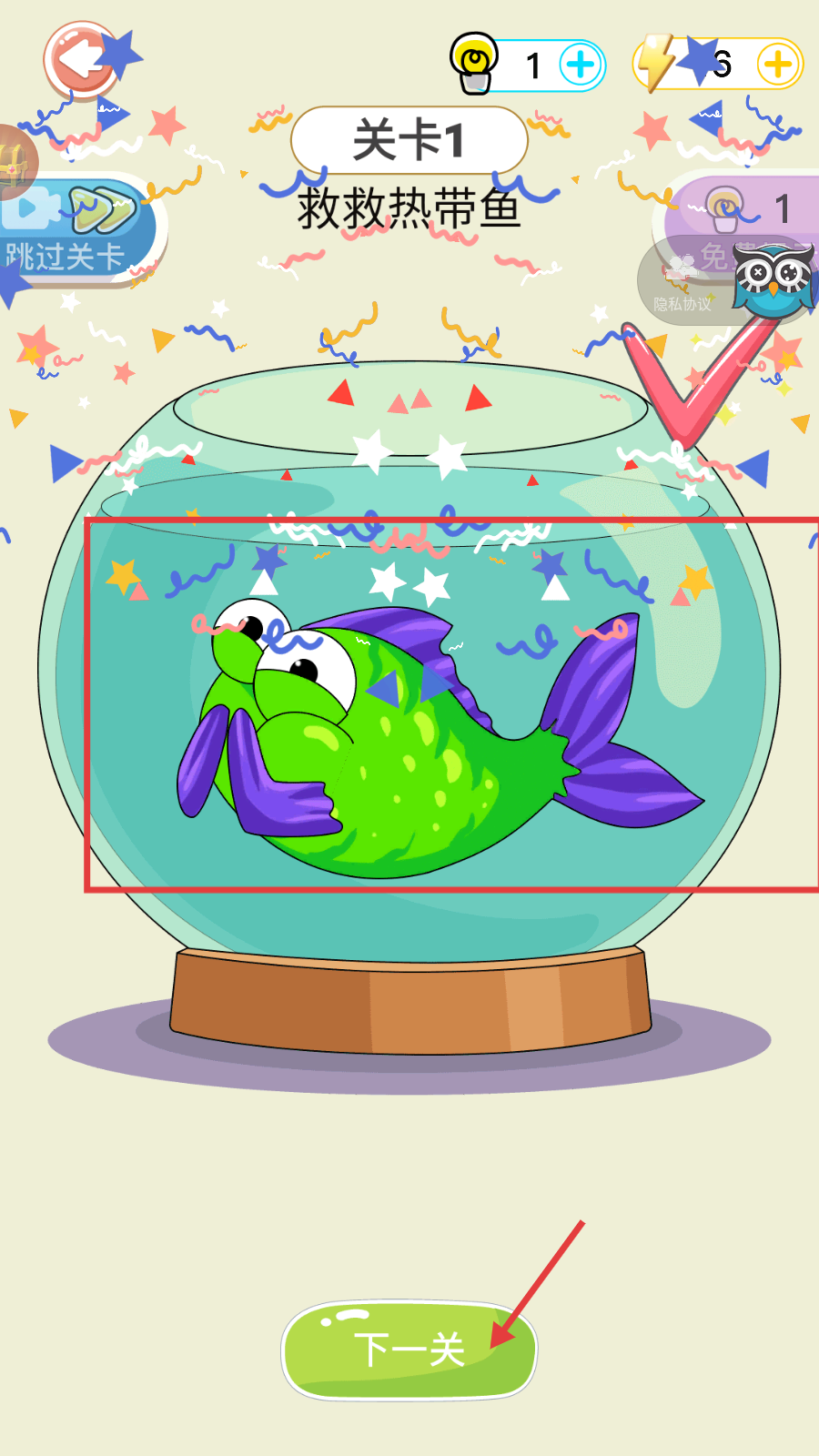 3、成功放置后,鱼进入鱼缸,点击【下一关】继续游戏。