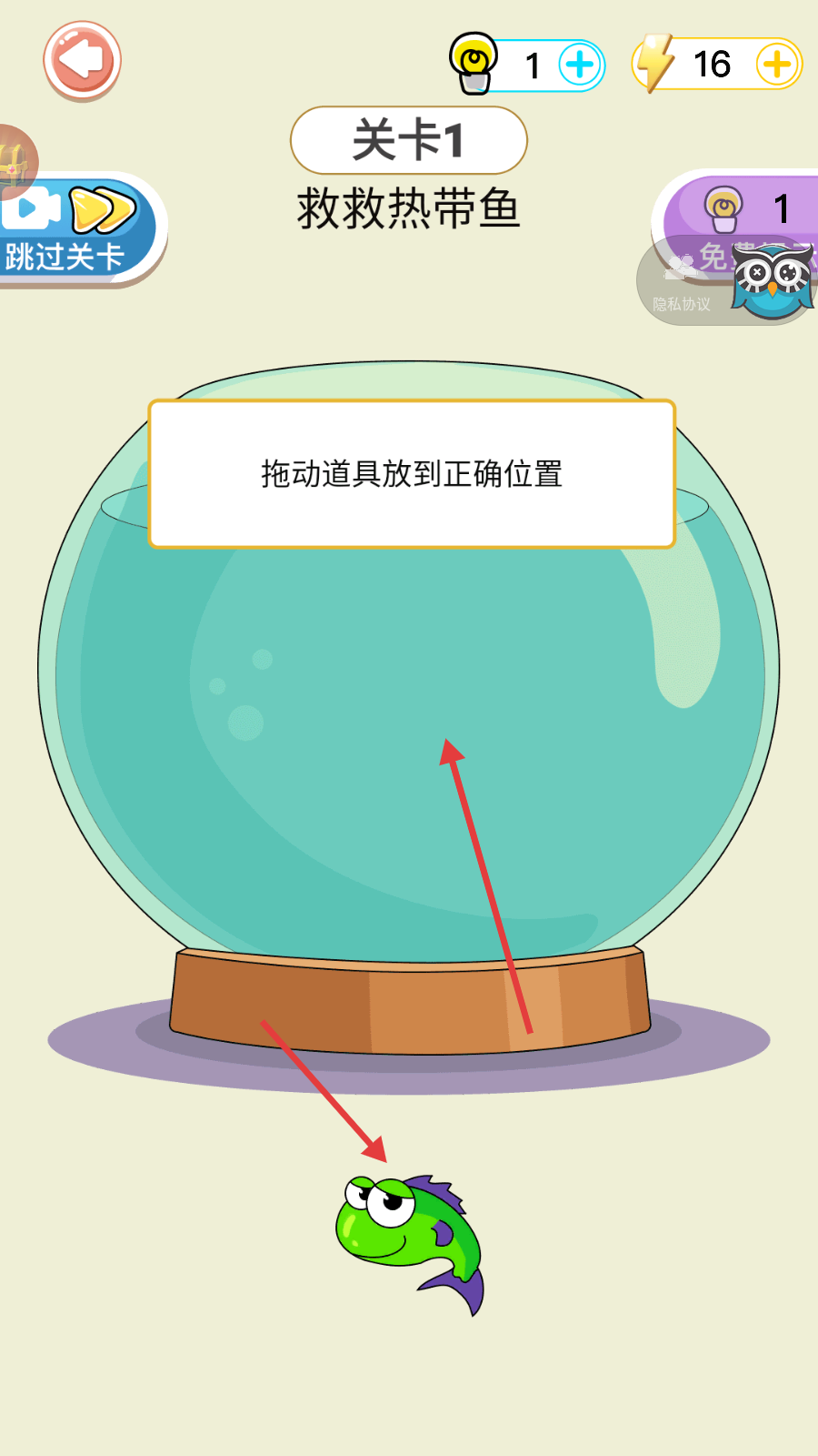 2、根据提示,拖动鱼到鱼缸内的正确位置。