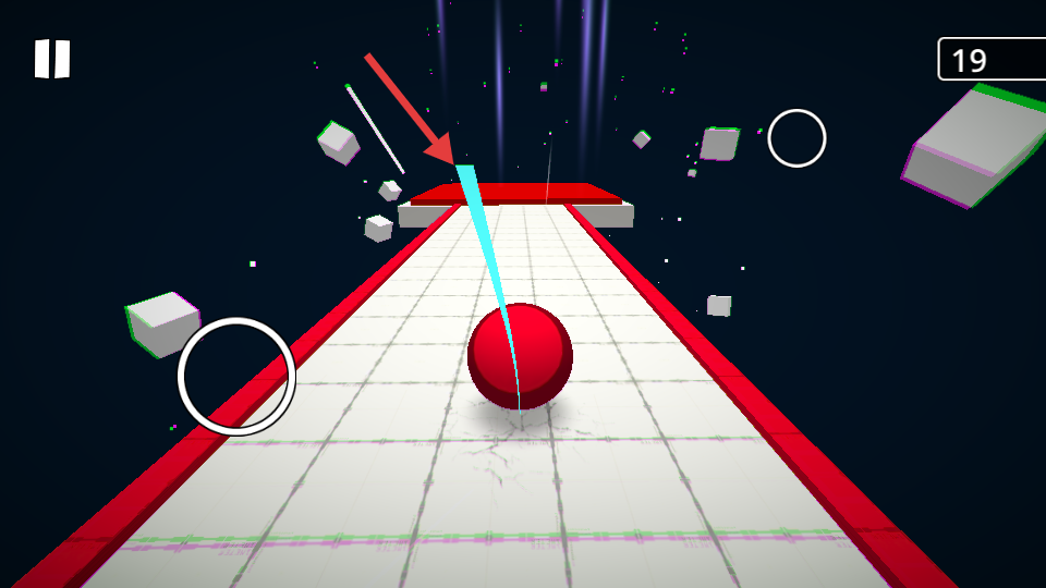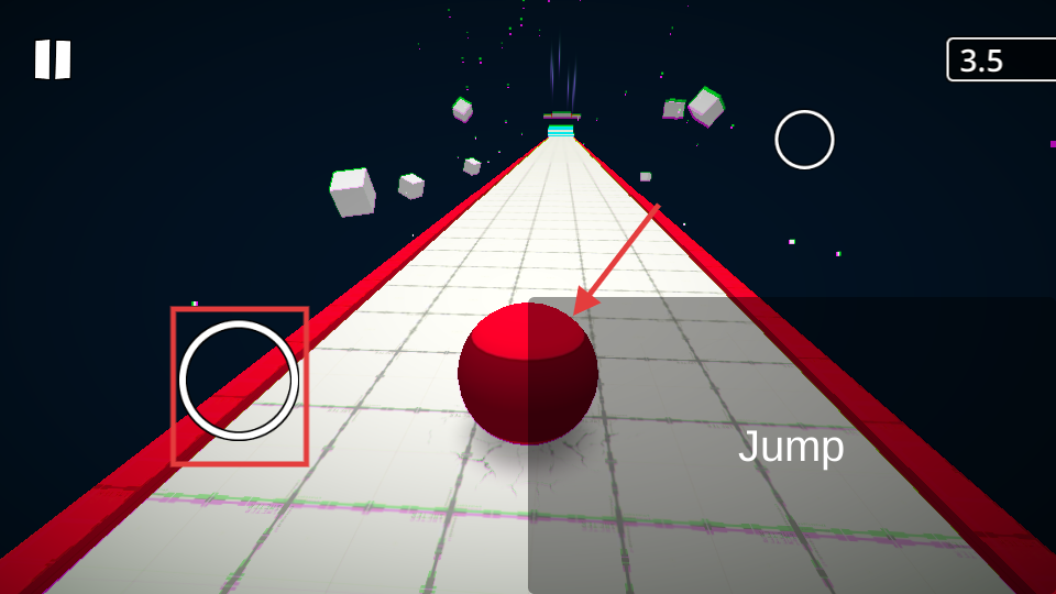 2、借助左侧虚拟按键操控红色滚球移动,持续前进。