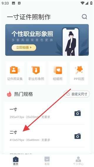 1、打开一寸证件照制作工具,在首页热门规格中选择目标尺寸(如“二寸”),进入对应尺寸的制作页面。