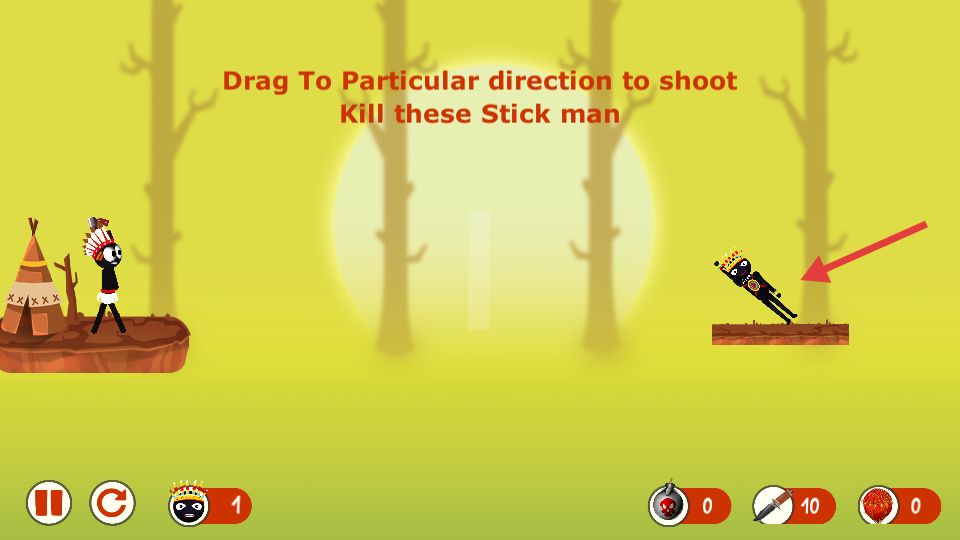 3、进入关卡后,按照提示拖动进行射击,消灭右侧的火柴人。