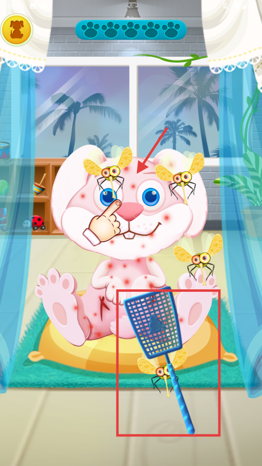 2、使用蓝色的苍蝇拍,拍走兔子身上的昆虫,清理掉这些干扰宠物的害虫。