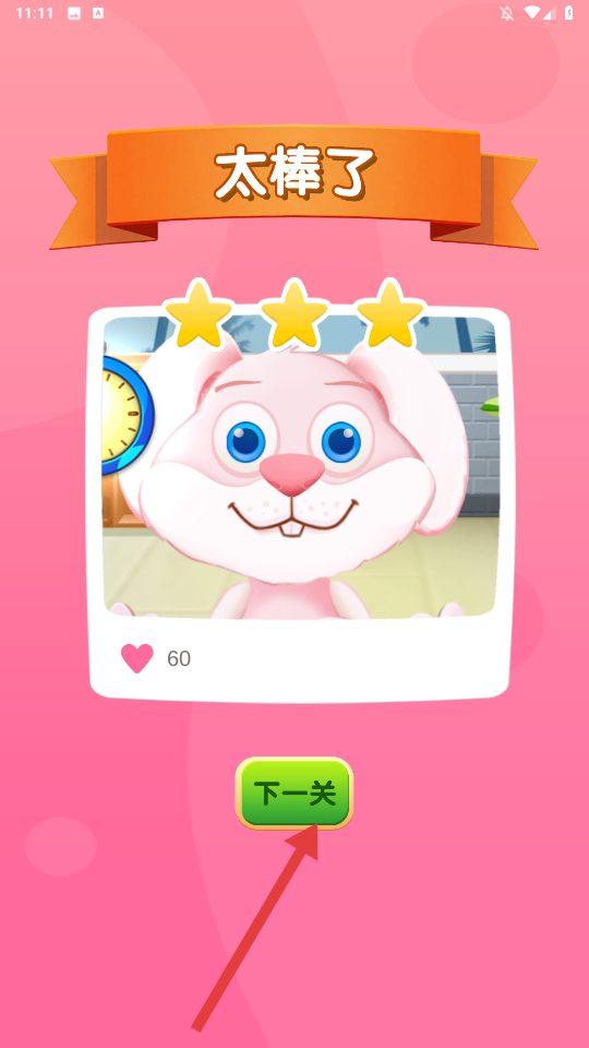 4、成功完成护理后,界面会显示【太棒了】并给出三颗星评价,点击【下一关】继续护理其他宠物。
