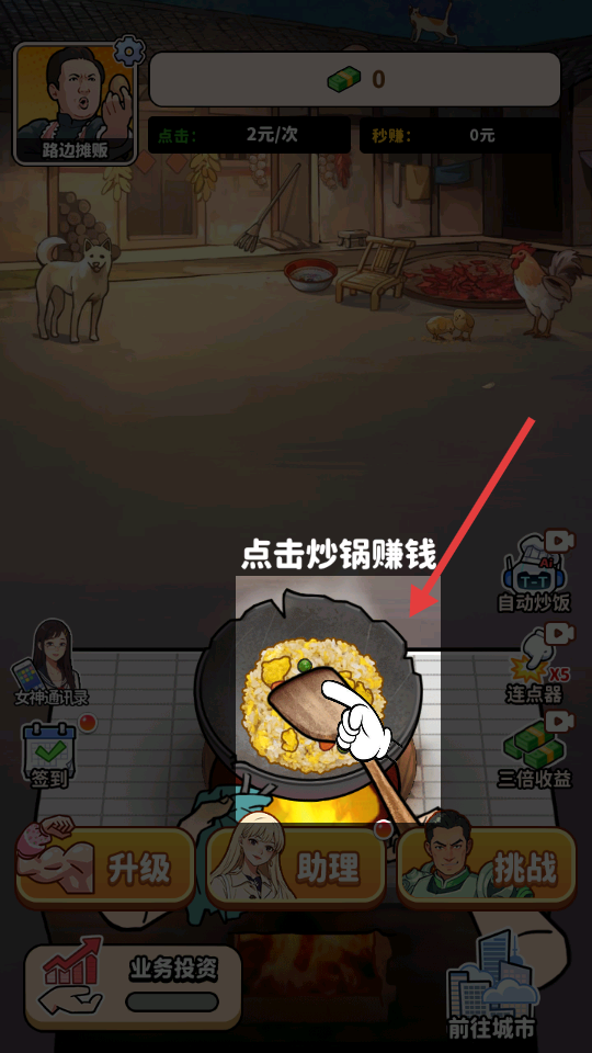 1、进入游戏,点击炒锅,每次可获2元,通过点击积累初始资金。