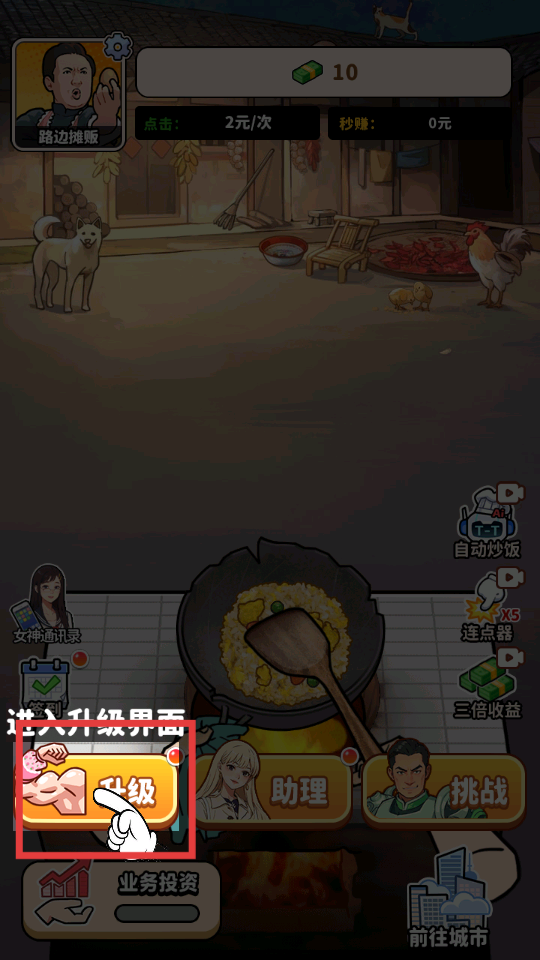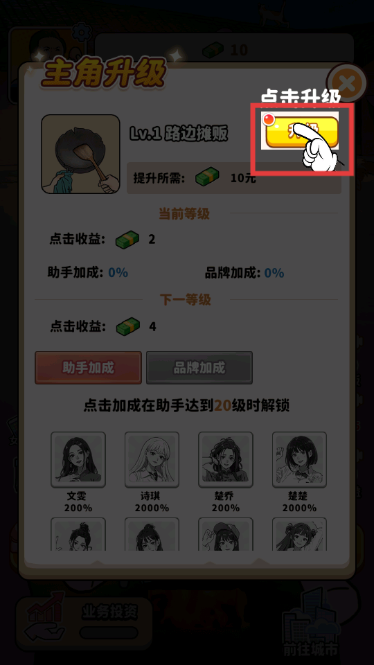 3、在“主角升级”界面,花10元点击【升级】,提升“路边摊贩”等级,增加点击收益。