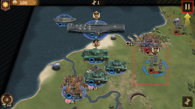 2、在战役地图中,留意红框内敌方部队,观察其位置与动向,同时可借助右上角暂停按钮,规划作战策略。