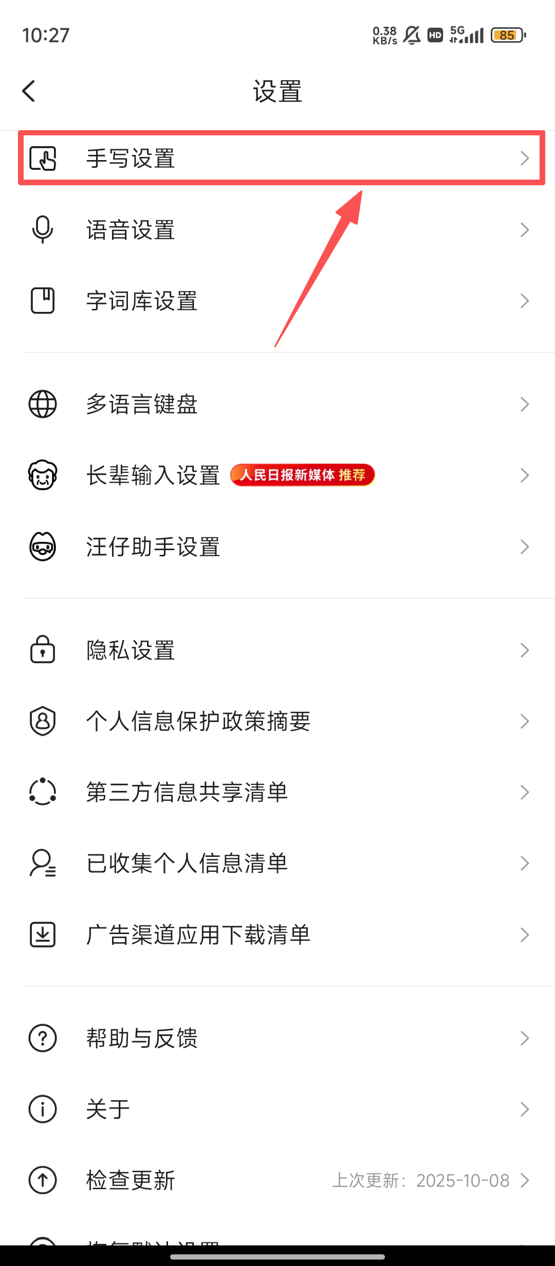 3、之后找到并点击【手写设置】选项,这样就能进到手写的具体设置页面,为调整手写参数做准备哦。