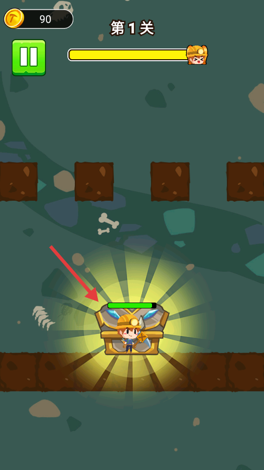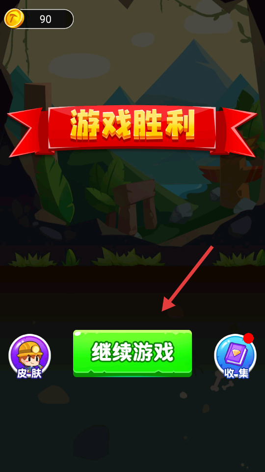 4、成功拿到宝箱后,界面显示“游戏胜利”,点击绿色【继续游戏】按钮,可进入下一段挖掘关卡。