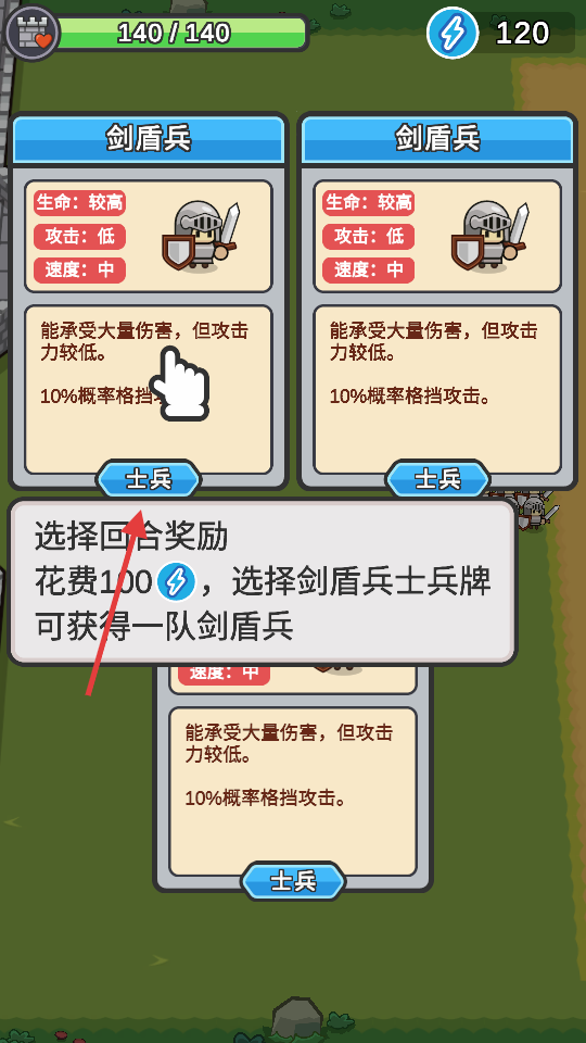 4、战斗胜利,可花费100闪电,可再次选择【剑盾兵】士兵牌,以此增强队伍的战斗能力。