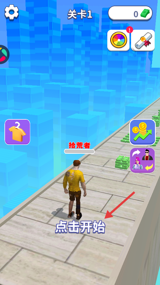 1、在“关卡1”界面,点击“点击开始”,操控“拾荒者”角色开启跑酷。