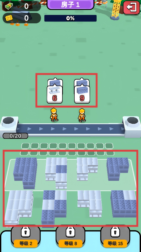 2、在建造界面,观察红框内的【积木模块和上方的数字标识】,合理选择积木,利用传送带等设施,将积木放置到对应位置进行搭建。
